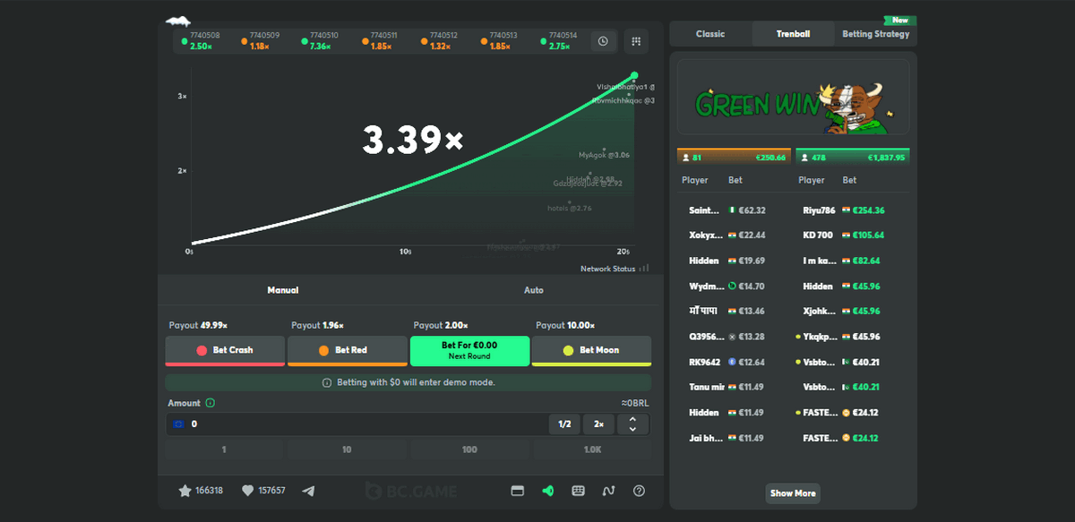 | Special Features | Trenball mode allows betting on predicted multiplier ranges (Red, Green, Moon) |