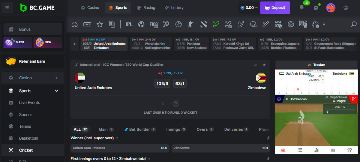 - Upon entering the site BC.Game, find the pane “Sports”.Cricket should occupy a place in the pane “Sports” at the BC.Game site. Click on it to see the full menu of available games and tournaments.