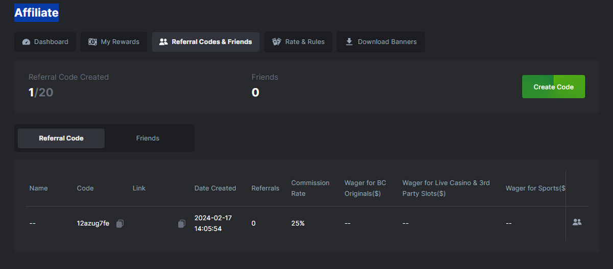 • Referral link creation. As an existing BC.Game user, you can generate a unique referral link from the “Affiliate” section. This personalized link serves as an invitation to potential new players, encouraging them to join and explore BC.Game.