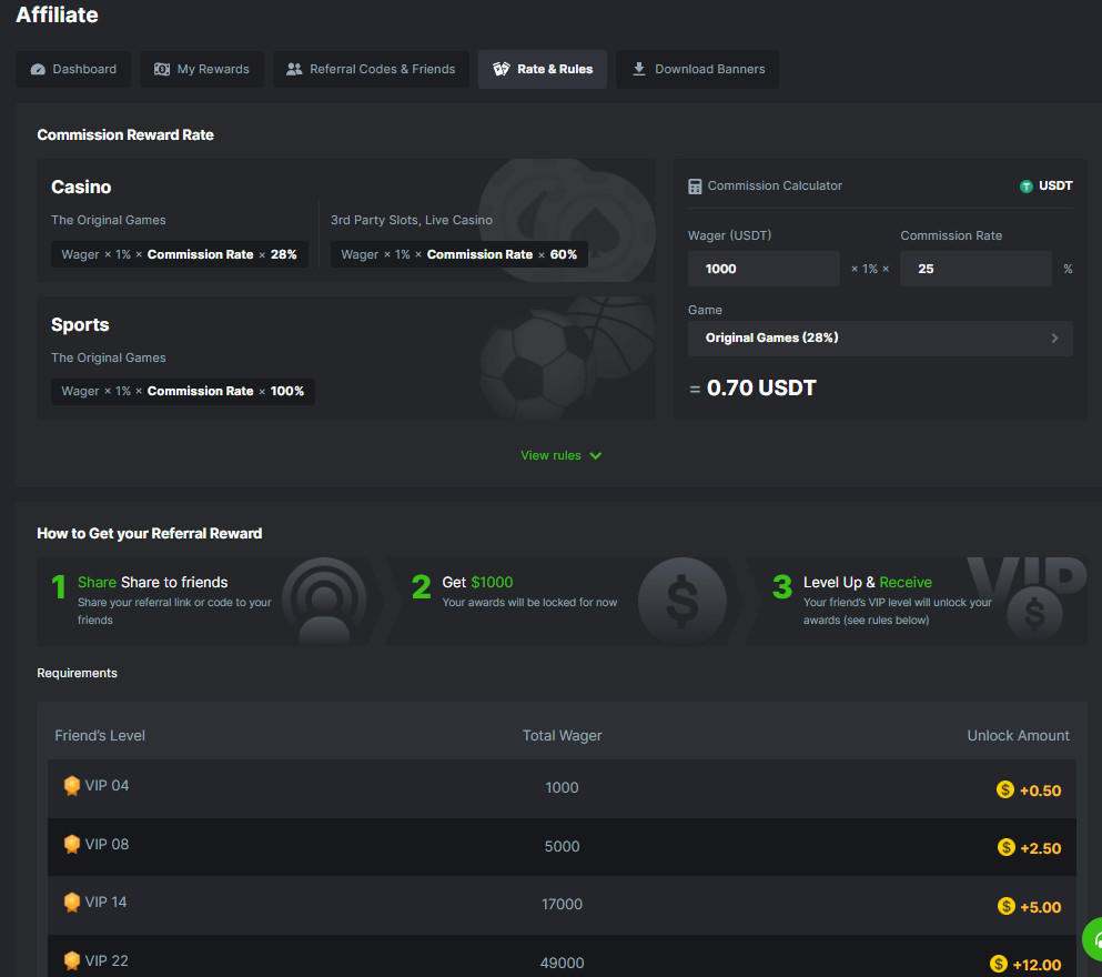 • Sports betting. Enjoy an even higher commission rate of 25% of the 1% wagered by your referrals on sports betting options available on the platform.
