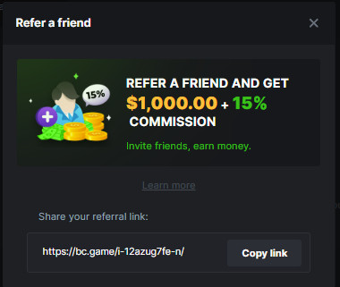 The BC.Game referral bonus allows you to receive up to 1000 USD for one friend referred through your referral link. However, the full amount can be received not immediately, but when the referral reaches a certain level.